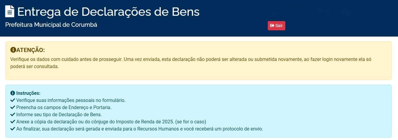 A Prefeitura de Corumbá estabeleceu normas para a entrega da declaração de bens e valores de autoridades e servidores do Executivo municipal. A Resolução nº 622, publicada em 19 de setembro, no DIOCORUMBÁ, fixa prazos, procedimentos e penalidades em caso de descumprimento da obrigação legal. Após o envio, o sistema não permite alteração nem reenvio do documento. Quem fizer login depois da submissão terá acesso apenas para consulta.