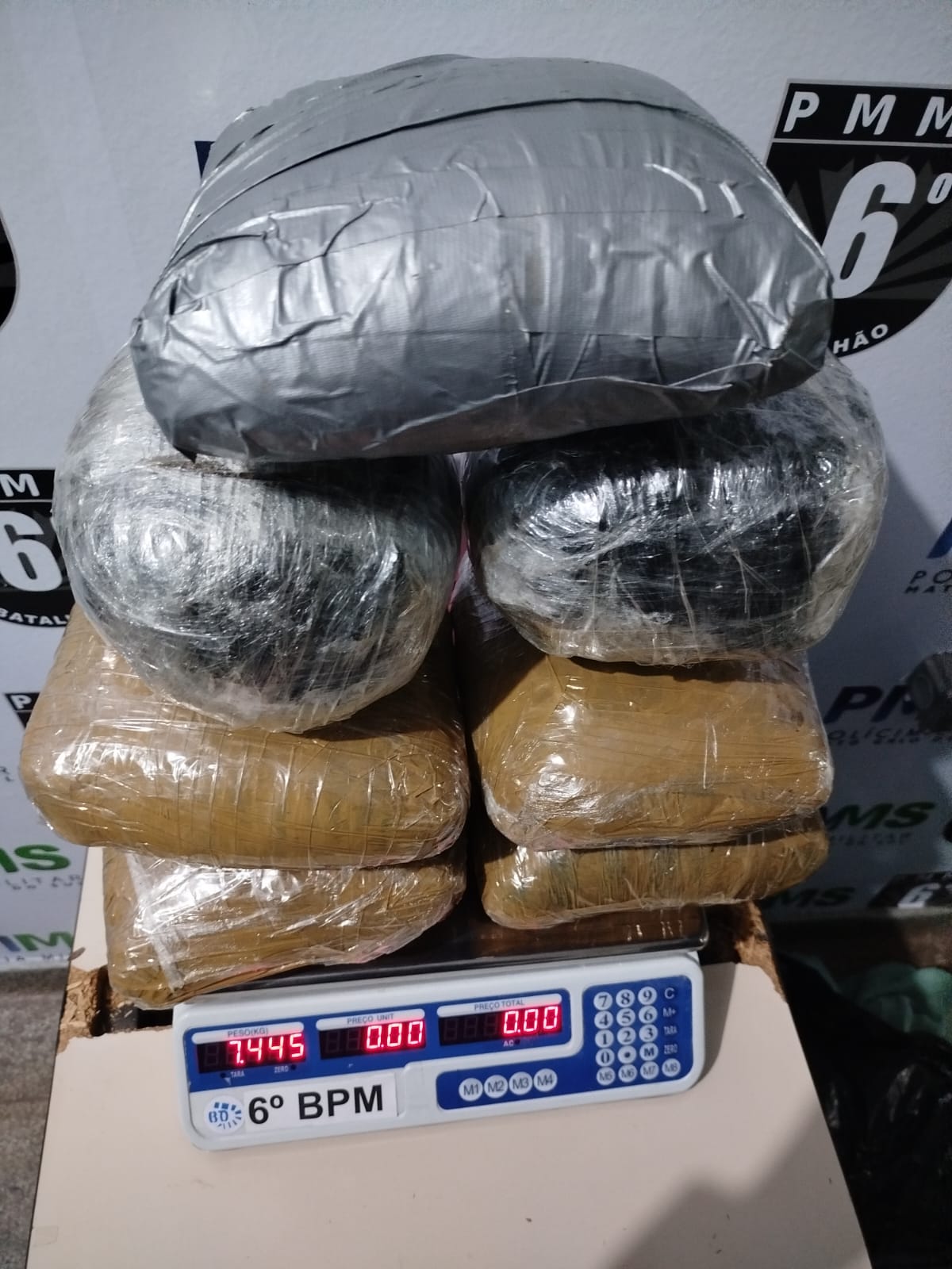 No interior de uma mala preta, foram encontrados sete tabletes de substância análoga à maconha, envoltos em fita adesiva, totalizando aproximadamente 7,445 quilos do entorpecente.